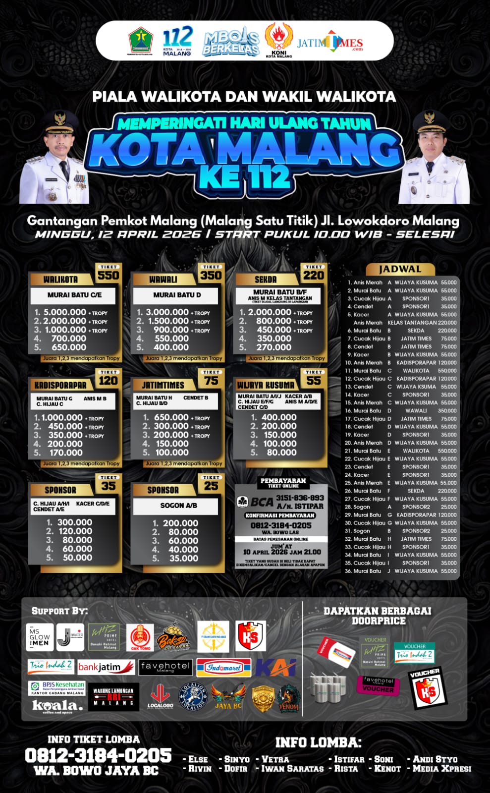 JATIMTIMES - Kemeriahan peringatan Hari Ulang Tahun Ke-112 Kota Malang terasa kuat melalui lomba burung berkicau. Kegiatan ini memperebutkan Piala Wali Kota dan Wakil Wali Kota Malang.